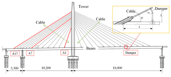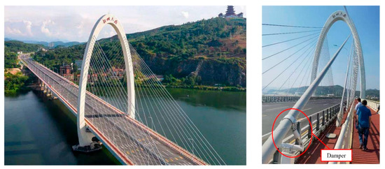 The main bridge of Shaozhou Bridge adopts steel–concrete composite beams with a single tower and double cable surface. The span arrangement of the bridge is 33 + 102 + 183 = 318 m, and the whole bridge adopts a half-floating system. The main beam adopts a streamlined flat box beam; the cable tower adopts an arched bridge tower, and the tower column is a reinforced concrete component. The whole bridge has 26 pairs of cables, a total of 52 cables. In the concrete beam section, the distance between the cables is 6 m; in the steel box beam section, the distance between the cables is 12 m, and the vertical distance on the tower between the cables is 2.0 m. The cable-stayed cable adopts the type 250 high-strength epoxy-coated steel strand diagonal cable; the standard strength is 1860 MPa, and the cable group anchor system is adopted. To suppress cable vibrations, an external passive damper is installed near the cable beam section. Figure 5 illustrates the structural layout of the bridge, while Figure 6 shows the installation of the cable dampers