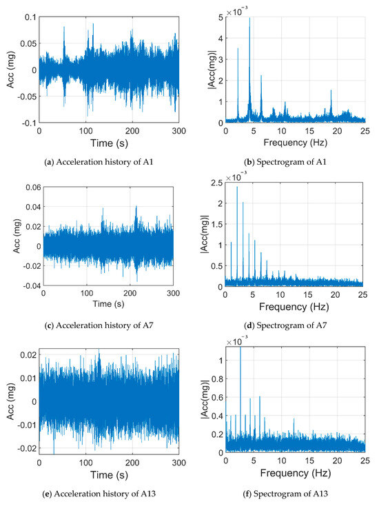 Considering the influence of different cable lengths, the A1, A7, and A13 cables of Shaozhou Bridge are selected for analysis. Table 4 outlines the key parameters of the cable-damper system for the cables analyzed in Shaozhou Bridge. Accelerometers are installed on the above three cables, and the sampling frequency is 50 Hz. In order to reduce the impact of vehicle load, the data at 2:00 a.m. on 1 July 2023 were selected for analysis, and the acceleration data duration was 5 min. The acceleration signal time-history curve and acceleration amplitude spectrogram are illustrated in Figure 7.