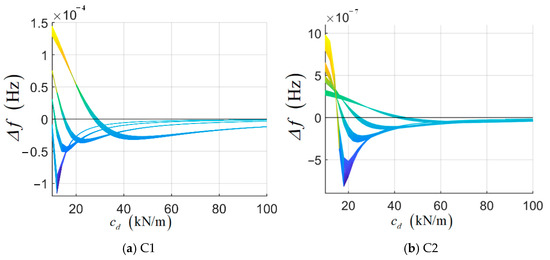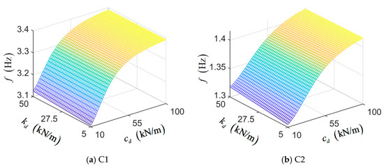 As can be seen from Figure 8, the influence of the damper damping coefficient on system frequency is much greater than that of damper stiffness. Under different , the damping coefficient has a smaller effect on the cable frequency. As the damping coefficient increases, the system frequency also rises. The influence of damper stiffness on cable frequency is different under different . When is small, has a significant effect on frequency. For the C1 cable, the maximum influence amplitude is 0.6%, and the C2 cable maximum influence amplitude can reach 1%.