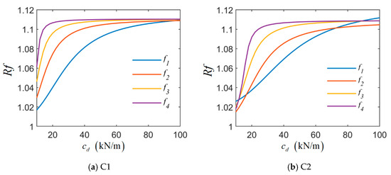From Figure 9, it can be seen that when the damper stiffness is determined, as the damping coefficient increases, the first four orders of the frequencies of the cable are increased, and the final increases in amplitude are all near 10%. However, when the damping coefficient increases to a certain value, the cable frequency tends to be stable and no longer increases. The value of Rf is close to that of the cable frequency when it is rigidly supported. This corresponds to the optimal damping coefficient that enhances the cable frequency. Beyond this point, increasing the damping coefficient further will not significantly increase the stiffness of the cable-damper system. This corresponds to the optimal damping coefficient of the damper at this frequency, representing the minimum damping required to prevent a significant increase in the stiffness of the cable-damper system. With the increase in frequency order, the optimal damping coefficient of cable frequency decreases. When the optimal damping coefficient is reached, increasing the damping coefficient has no significant effect on the adjustment of the cable-damper system stiffness. This shows that the damping coefficient should be selected according to the target order frequency in the actual design of a cable-damper system. The lower the frequency order, the greater the damping coefficient required to achieve the same frequency increase.