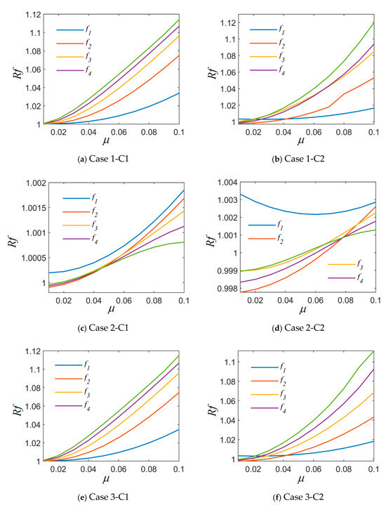 From Figure 11, except for the first order frequency of the C2 cable in Case 2, the first four order frequencies of the cable all increase with the installation height of the damper. This shows that, the higher the damper is installed, the more beneficial it is to increase cable stiffness. As seen in Figure 11a,b, when only the damping coefficient is considered, the impact of installation height on frequency increases exponentially. The effect on high-order frequencies is more significant than that on low-order frequencies. The increase in frequency at 0.1 installation height is nearly 12% higher than that at 0.01 installation height. It can be seen from Figure 11c,d that, when only the stiffness of the damper is considered, when the height of the damper is relatively small, will weaken the system stiffness, which is unfavorable to the system. For the short cable C1, when the installation height is around 0.02 , the influence on the first four order frequencies is positive. For the long cable C2, when the installation height is around 0.065 , the influence on the first four order frequencies is positive. It can be observed that, compared to the short cable, the installation height required for the long cable is greater. However, from the perspective of influence amplitude, when is fixed, the influence of on the first four order frequencies of the two cables is less than 0.3%. It can be seen from Figure 11a–d that the influence of on system frequency can be ignored compared with the influence of on system frequency. Therefore, in Figure 11e,f, when the damper has both damping coefficient and stiffness, the influence on the cable-damper system is mainly guided by the damping coefficient of the damper, and its variation rule is similar to that of Figure 11a,b.