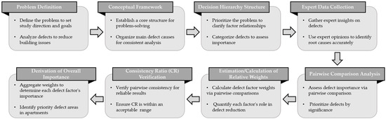 Expert consultation was sought to validate the appropriateness of the items related to the selection of defect factors and the identification of causes in multifamily housing structures to incorporate the AHP survey. Each defect was thoroughly reviewed to verify specific items for defect prevention and key management targets, enabling an in-depth analysis of the major and frequently occurring defects in multifamily housing structures.