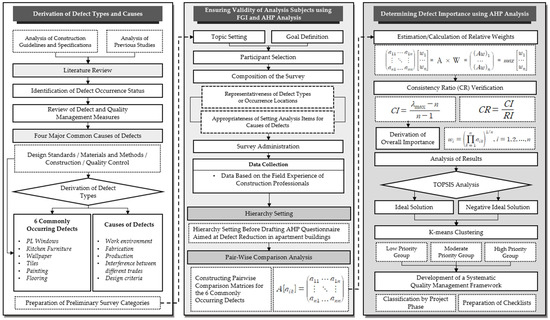 This section outlines a three-step framework designed to identify and prioritize defect risk factors in various types of multifamily housing buildings, with the goal of establishing quality management strategies across project phases. The first step involved identifying key factors related to defects in multifamily housing structures based on the literature review and previous studies. These factors formed the foundation for the final risk assessment model, which was further refined through an FGI survey in the next step. The second step involved executing the FGI survey, based on the risk factors identified in the literature review. This survey gathered expert insights from a group of industry practitioners, academic researchers, and defect management specialists, who assessed the real-world importance of the risk factors based on actual defect cases encountered in the field. The third and final step applied the analytic hierarchy process (AHP) method to assess the relative importance of each risk factor based on the expert opinions collected during the FGI survey. The results of the AHP analysis were then integrated into the TOPSIS method to quantitatively evaluate the priorities of the identified risk factors. Furthermore, based on the TOPSIS scores, K-means clustering was conducted to group the defect types according to their shared characteristics. Based on these insights, quality management strategies for each project phase were then developed. Figure 3 illustrates these three steps.