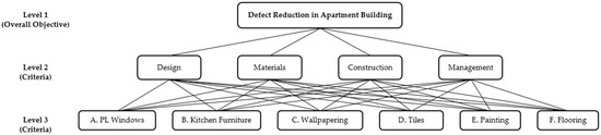 The AHP provides a methodology for the objective quantification of the importance assessments of field experts regarding defects, which is essential in conducting an importance analysis focused on defect reduction in multifamily housing structures. Additionally, the process of synthesizing weights through consistency verification and geometric mean calculations enhanced both the reliability and validity of the results. In the first step of the AHP method, the problem is defined, and a hierarchical structure is established to address it. Defects in multifamily housing buildings require the hierarchical structuring of complex factors, as they involve multiple considerations, including economic costs, the frequency of occurrence, and the severity of defects. Therefore, the top level was set with the ultimate goal of defect reduction in multifamily housing. Based on the defect factors identified in the in-depth analysis of the literature and the FGI survey results, the first level was categorized into four main criteria: design, construction, materials, and management. The second level was structured with six specific subcriteria: (a) PL windows, (b) kitchen furniture, (c) wallpaper, (d) tiles, (e) paint, and (f) flooring. This hierarchical structure allowed for a systematic analysis of the importance and frequency of each defect by logically decomposing the complex factors associated with multifamily housing defects, which are intertwined with various defect types and causes. The hierarchical structure established for multifamily housing defects is shown in Figure 4.