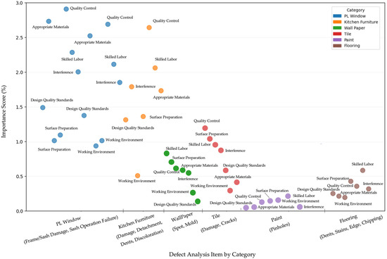 The category “PL windows” (0.381) was identified as the highest-priority category and recognized as the most influential factor among the defects in the six major defect-prone categories. This is likely because defects in PL windows can lead to major functional issues, such as insulation failures, noise, condensation, and water leakage. Additionally, defects in PL windows, a frequently used component, can cause substantial inconvenience in daily life.