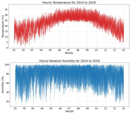 Figure 1 shows the hourly temperature data and the relative humidity from the suburban weather station over 2014 to 2019. The temperature data exhibit a pronounced seasonal pattern, with peak temperatures occurring during the summer months (June to September), often exceeding 30 °C. This pattern is consistent with Guangzhou’s subtropical monsoon climate, where hot and humid summers are a defining characteristic. In contrast, winter temperatures (December to February) are significantly lower, typically ranging between 10 °C and 20 °C, reflecting the mild nature of winters in this region.
