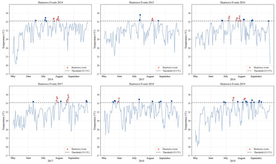 Heat wave events during 2014 to 2019 in Guangzhou.