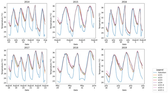 Hourly outdoor temperature during heat waves in suburban and LCZs.