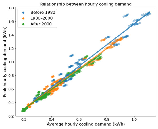 To analyze the impact of envelope thermal performance on the variation trends of the cooling demand, the relationship between the average hourly cooling demand and peak hourly cooling demand is illustrated in Figure 6. Each point on the graph represents a residential unit’s record during a specific heat wave. Buildings constructed within the same period, and thus with a similar thermal performance of the building envelope, are grouped together for comparison.
