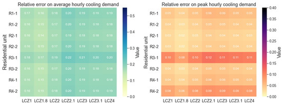 Relative errors on the average and peak hourly cooling demand, ignoring UHI effects.