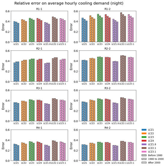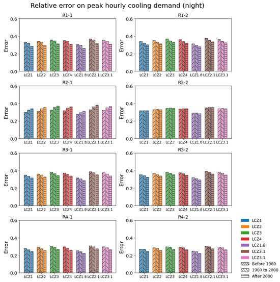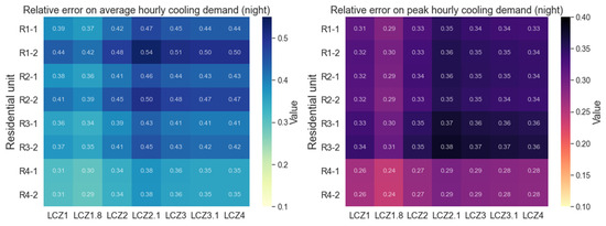 Relative errors on the average and peak hourly cooling demand at night, ignoring UHI effects.
