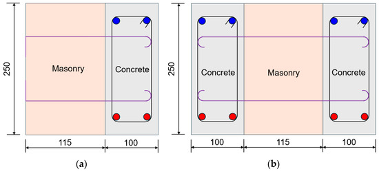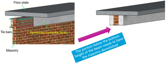 Masonry structures have been extensively utilized in residential, educational, and commercial buildings, representing a traditional form of construction [1,2,3,4,5]. With societal and economic advancements, it has become essential to implement reinforcement modifications in existing masonry structures to maximize the utilization of large spaces [6,7,8,9]. Currently, the commonly used reinforcement and modification technique involves symmetrically adding concrete beams to both sides of the top of the wall to be demolished. These new beams typically form a frame structure with concrete columns added at both ends of the wall. Subsequently, the masonry load-bearing wall portion below the bottom of the reinforced concrete beams is removed, thereby creating a composite beam that shares the load between the reinforced concrete and some masonry. The beams and walls work together to bear the vertical loads from the floor slabs. This method is illustrated in Figure 1. Engineering practice shows that the newly added symmetrically placed concrete beams require closed stirrups, leading to a larger width of the new beams in the composite beam. When setting up reinforced concrete columns at the junction of the masonry load-bearing walls, i.e., at the supports of the composite beams, it may result in excessively large column cross-sections, potentially creating short columns that are unfavorable for seismic resistance.