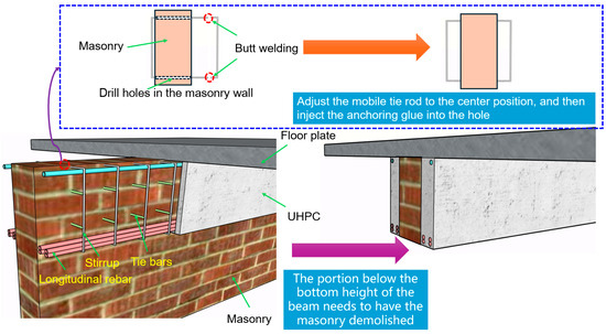 The construction method for the UHPC–brick masonry composite beam is as follows: First, drill holes in the existing masonry wall, insert U-shaped stirrups, and weld them in place to ensure that the stirrups are centered. Then, inject anchoring adhesive into the holes. Next, tie longitudinal reinforcement on the inner sides of the upper and lower stirrups on both sides and drill holes to insert linear tie rods. After that, set up formwork to pour UHPC and perform curing. Finally, after the UHPC reaches the design strength, remove the formwork and chisel away the masonry wall below the UHPC beam. The weld point is set at the edge position, which can effectively reduce stress concentration in this area and avoid local damage due to stress concentration, thereby improving the overall load-bearing capacity of the beam. The welded connections can reduce the tying processes during construction, shorten construction time, and lower labor costs, thereby improving construction efficiency. Additionally, the welded stirrups will not experience changes in reinforcement placement due to loosening of the ties when under load, ensuring the effective performance of the stirrups in the concrete and thus enhancing the overall performance of the beam.