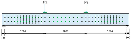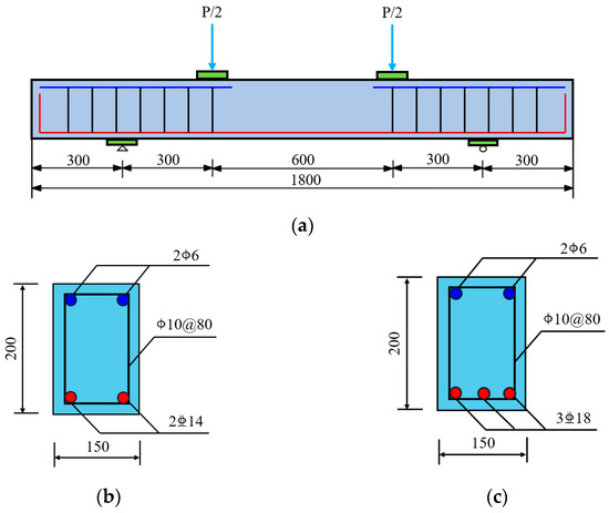 Zheng et al. [22] conducted experimental research on the flexural performance of six reinforced concrete beams incorporating active powder in the positive section. This study selects specimens L-2 and L-4, which are adequately reinforced beams, for finite element validation. The geometric dimensions and reinforcement details of these specimens are illustrated in Figure 4. Specifically, the specimens have a total length of 1800 mm, a calculated length of 1200 mm, and uniform cross-sectional dimensions of 150 mm × 200 mm. The experimental beams were loaded at quarter points, resulting in a pure bending segment length of 600 mm, with 300 mm allocated at both ends for the supports. The measured compressive strength of the RPC prism, fc, is 102.28 MPa, and the longitudinal reinforcement consists of HRB400 steel bars with diameters of 14 mm and 18 mm, exhibiting measured yield strengths (fy) of 476.5 MPa and 467.6 MPa, respectively, along with an elastic modulus (Es) of 2.0 × 105 MPa. The stirrups and vertical bars employ HPB235 steel bars with diameters of 10 mm and 6 mm, respectively, showing measured yield strengths (fy) of 275.0 MPa and 275.2 MPa, along with an elastic modulus of 2.1 × 105 MPa. The constitutive relationship for the RPC and steel bars within the finite element model of the reinforced RPC beam remains consistent with that detailed in Section 2.1.