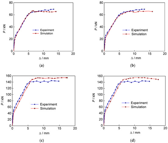 Figure 5 provides a comparison between the experimental and simulated vertical load–midspan deflection (P-∆) curves for the reinforced RPC beam. The results indicate that the simulated load–deflection curve closely aligns with the experimental data, with discrepancies in peak loads of 3.13% and 1.96%, respectively.
