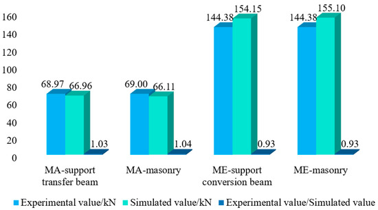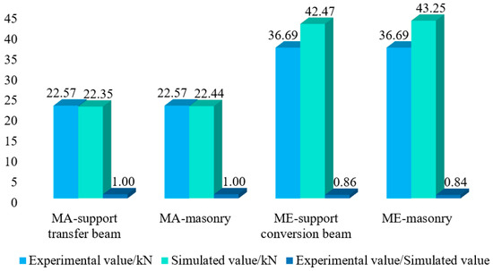 Figure 7 presents a comparison of the load–deflection curves at midspan for the concrete–brick masonry composite support transfer beam. The figure indicates that the general patterns of the load–midspan deflection curves are largely similar, with the peak load of the ME specimen being marginally higher. This discrepancy may arise from the exclusion of the bond slip effects between different materials during the simulation. To further validate the consistency between the simulated cracking load and ultimate load values and their corresponding experimental values, the ratios were computed, as illustrated in Figure 8 and Figure 9. The average ratio of the experimental to simulated values is 0.953, with a standard deviation (σ) of 0.071 and a coefficient of variation (δ) of 0.074. These results indicate that the simulated load values for the concrete–brick masonry composite support transfer beam closely align with the experimentally measured values, thus demonstrating a high level of agreement.