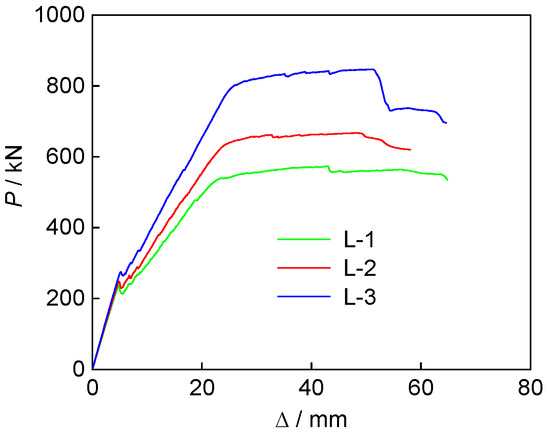 The specimens L-1, L-2, and L-3 maintain constant thickness and strength grade of the UHPC layer, while varying the reinforcement ratio of the tensile area longitudinal reinforcement. For these specimens, each one-sided beam is supported by four longitudinal tensile reinforcements with diameters of 20 mm, 22 mm, and 25 mm, corresponding to reinforcement ratios of 2.62%, 3.17%, and 4.09%, respectively. Comparative analysis revealed that, under consistent conditions, an increase in the longitudinal reinforcement ratio leads to a slight rise in the cracking load of the UHPC, whereas both the yield load and peak load of the reinforcement show substantial increases. Specifically, the yield loads of the L-2 and L-3 specimens improved by 8.6% and 50.2%, respectively, compared to the L-1 specimen, while their peak loads increased by 16.3% and 47.6%, respectively. Increasing the diameter of the longitudinal reinforcement significantly enhances the load-bearing capacity of the composite beam, making this approach a cost-effective strategy for engineering applications. The load-versus-midspan-deflection curves for L-1, L-2, and L-3 obtained from ABAQUS simulations are illustrated in Figure 13.