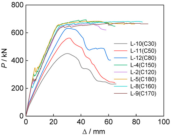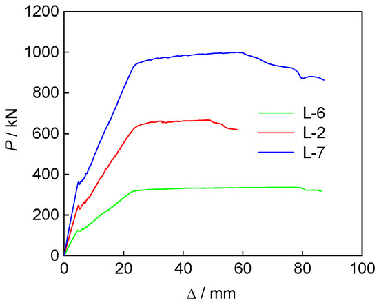 The specimens L-2, L-6, and L-7 maintain a consistent reinforcement ratio and UHPC strength grade, with variations in the UHPC layer thickness set at 40 mm, 80 mm, and 120 mm, respectively. Comparative analyses indicate that, when all other factors remain constant, increasing the thickness of the UHPC layer significantly enhances the cracking load, yielding load, and peak load of the test beams. Specifically, the cracking loads for specimens L-2 and L-7 are 99.4% and 193.2% greater than that of L-6, respectively, while the yielding loads increase by 79.6% and 187.6%, and the peak loads rise by 98.9% and 198.1%, respectively. Notably, to maintain the reinforcement ratio, two additional reinforcement bars must be incorporated for every 40 mm increment in UHPC layer thickness. The load–midspan deflection curves obtained from ABAQUS simulations for L-2, L-6, and L-7 are presented in Figure 14.
