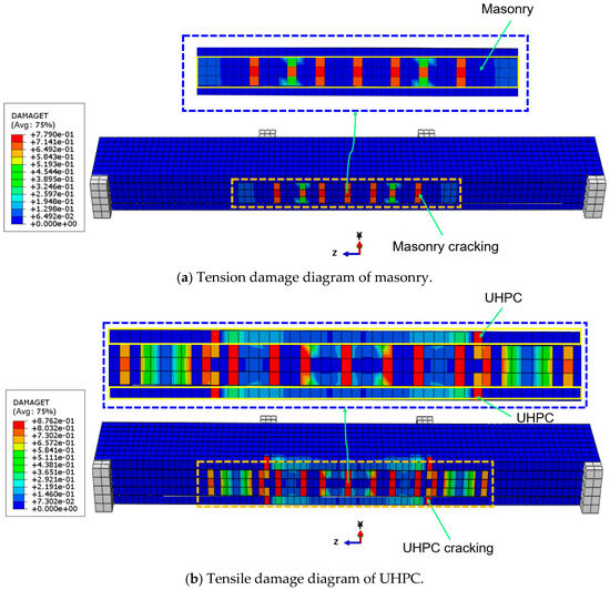 The cracking state of the test beam can be represented by the tensile damage (DAMAGET) in UHPC and brick masonry. Initially, the UHPC and brick masonry functioned cohesively. When the load increased to 167.56 kN, cracks first emerged at the center of the masonry’s bottom section, corresponding to the DAMAGET distribution illustrated in Figure 16a. As the load further increased, the cracks extended from the central bottom toward both sides, and the UHPC exhibited cracking when the load reached 264.93 kN, at which point the DAMAGET distribution is depicted in Figure 16b.