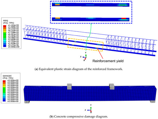 The displacement loading is progressively applied, and the load is continuously increased. The equivalent plastic strain (PEEQ) is monitored to ascertain whether the rebar yields. The distribution diagram of the equivalent plastic strain of the rebar is illustrated in Figure 17a, where a PEEQ value greater than 0 indicates the onset of yielding in the tensile longitudinal reinforcement, occurring at a load of 518.39 kN. Furthermore, the concrete compressive damage map (DAMAGEC) reveals no damage distribution within the compressive zone of the test beam; at this stage, the concrete remains uncrushed, as depicted in Figure 17b.