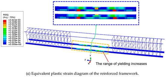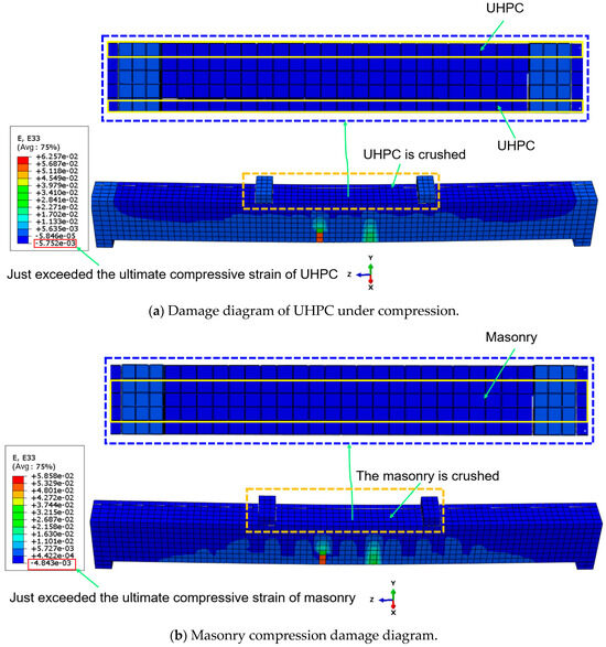 When the midspan displacement reached 41.90 mm, the load peaked at 658.15 kN. As the midspan displacement further increased to 49.93 mm, the top compression zone of the UHPC in the test beam first attained the ultimate compressive strain of 5.34 × 10−3. The longitudinal strain (E33) in the test beam is illustrated in Figure 18a, revealing that the UHPC experienced crushing at a load of 631.62 kN. Subsequently, when the midspan displacement reached 54.98 mm, the masonry in the top compression zone achieved an ultimate compressive strain of 4.8 × 10−3, indicating partial crushing of the masonry; at this stage, the load was 615.61 kN, as presented in Figure 18b. The crushing of the UHPC signifies that the test beam has entered a failure state. At this moment, the equivalent plastic strain distribution of the reinforcement is depicted in Figure 18c, demonstrating an increased yield capacity for the tensile reinforcement.
