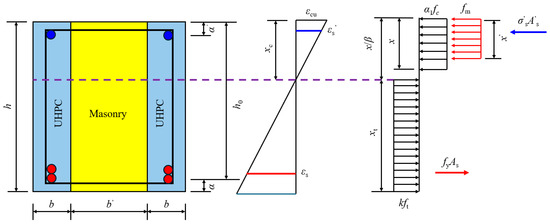 The calculation of the bending capacity of the cross-section is based on the following assumptions: (1) the plane section assumption; (2) effective bonding and anchoring between the reinforcement and UHPC, such that relative sliding does not occur; (3) the bond connection between the masonry and UHPC is considered, disregarding the influence of bond slip; (4) the contribution of UHPC in tension at the section is acknowledged; and (5) the stress–strain constitutive relationships for reactive powder concrete, reinforcement, and masonry are detailed in Section 2.1, where the constitutive model for reactive powder concrete is derived from a model proposed by Zheng [22] in the literature.
