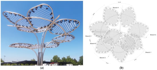 (a) Photo of the upper part of the “Artificial Tree”; (b) top plans of the system.