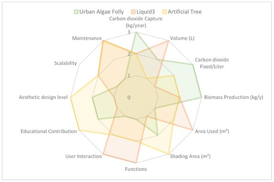 This comparison illustrates how different projects emphasize distinct aspects of sustainability. The Artificial Tree stands out in almost every category, highlighting its design and balanced performance across multiple areas, showing potential as a sustainable urban solution. Urban Algae Folly shows balance but lags in scalability, functions, and user interaction, while Liquid3 performs well across the main criteria but lags in shading area, educational contribution, and design complexity in comparison to the other systems. Through this comprehensive evaluation, a clearer understanding of each project’s impact on urban sustainability is achieved, reflecting their individual strengths in contributing to greener, more sustainable cities.