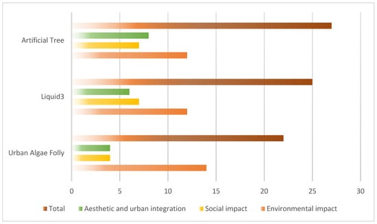 Finally, Figure 6 presents the results of the qualitative multicriteria analysis for three urban sustainability projects: Artificial Tree, Liquid3, and Urban Algae Folly. Each bar represents cumulative scores in environmental impact, social impact, and aesthetic and urban integration. The Artificial Tree stands out with balanced performance across all categories, particularly in environmental impact and social integration. Liquid3 excels but lags slightly in environmental impact, while Urban Algae Folly performs moderately in aesthetic integration and social impact, reflecting distinct design strengths for urban settings.