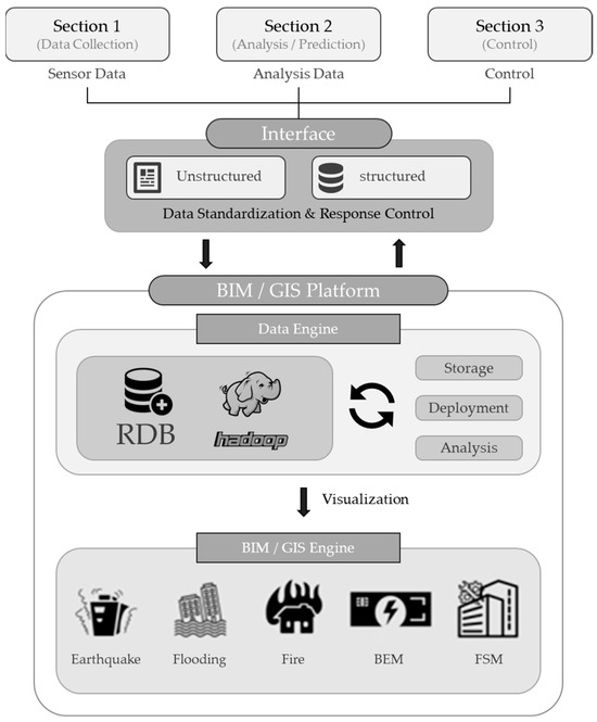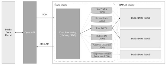 The relationship diagram of the Public Data Portal, OpenAPI, Data Engine, and BIM–GIS Engine is shown in Figure 4. The platform efficiently integrates external data sources with internal analytics to provide comprehensive insights. The flow of data from public portals through the data engine into the BIM–GIS engine highlights the capacity of the platform to process complex datasets and generate actionable information.