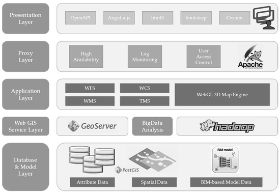 An open disaster information platform employs a multi-layered system architecture to support a seamless data flow, real-time monitoring, and actionable insights for effective disaster management. This architecture integrates BIM, GIS, and IoT sensor data to provide a unified framework for analyzing complex disaster scenarios. This design emphasizes interoperability between data sources and system components, ensuring flexibility in various emergency situations. The open platform structure consists of five interconnected layers: presentation, proxy, application, WebGIS service, database, and model (Figure 2). These layers ensure that the platform can deliver accurate information in real-time while maintaining operational stability during emergencies.