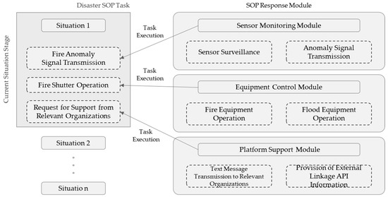 The modular design ensures that the platform can flexibly manage fires, floods, and earthquakes, thereby offering tailored responses for each scenario (Figure 5). The SOP tasks and response module architecture is divided into three main categories: monitoring, control, and support. These modules work together to ensure that all critical actions are executed efficiently, thereby reducing response times and minimizing risks during emergencies.