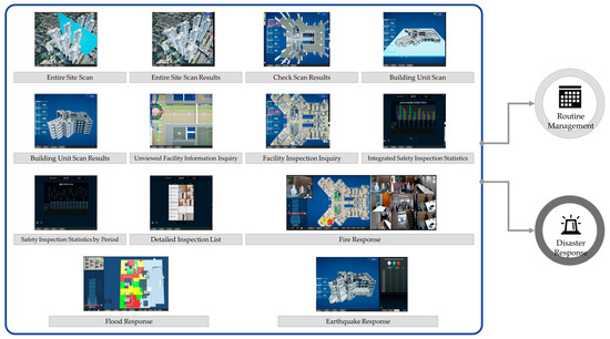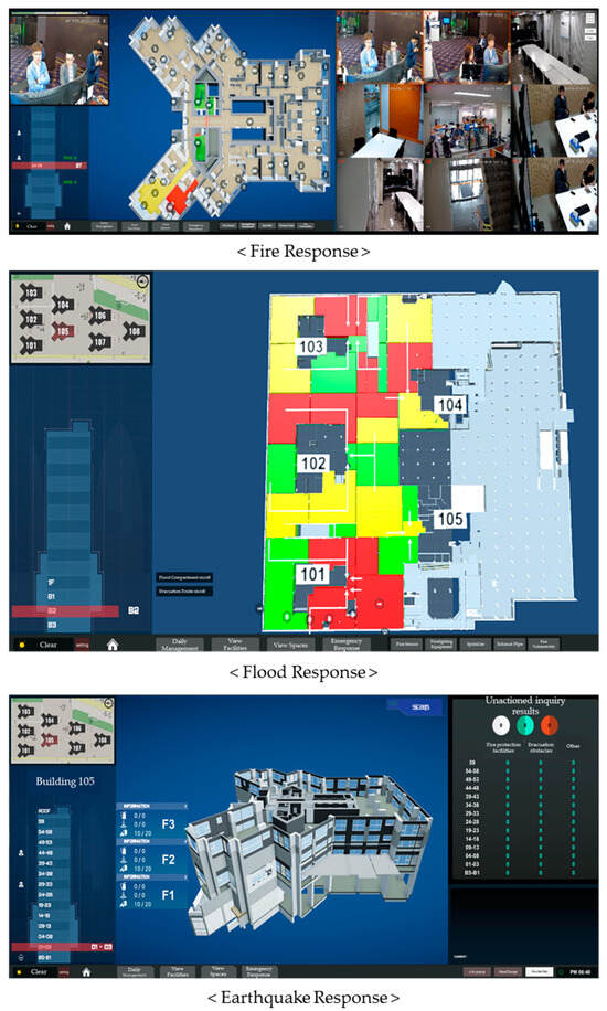 High-rise and complex facilities have become increasingly prevalent in urban landscapes and present unique challenges to disaster management and response [1]. The intricate architectures and multifaceted functionalities of these structures amplify the risks and complexities associated with disasters, such as fires, earthquakes, and floods [2]. To address these challenges, this study examines disaster management, building information modeling (BIM), geographic information systems (GIS), and facility management to address these challenges [3]. Current disaster-response systems often operate using isolated databases specific to each type of disaster, leading to inefficient information utilization and delayed response times. These systems typically lack the capacity for the integrated management of high-rise and complex facilities, making it difficult to respond effectively to both individual and compound disaster scenarios. In addition, there is a noticeable absence of interfaces supporting analysis systems for different types of disasters, which further hinders comprehensive disaster management.