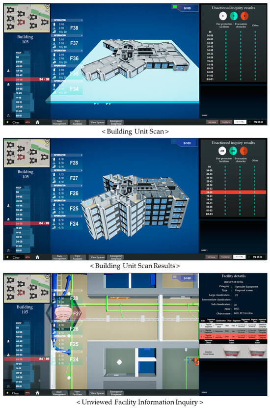 The facility management service for building-specific maintenance, as illustrated in Figure 12, allows users to conduct scans at the building level to identify unresolved inspection tasks associated with key facilities. This view enables users to quickly assess unaddressed facility issues and identify areas where maintenance is pending. By selecting unresolved items, users can access detailed information and historical records for each facility, ensuring that outstanding issues are promptly resolved, and building-level safety standards are met. This breakdown of the building-specific scanning functionality shows how users can identify and review unresolved inspection tasks in each facility. This feature enhances the maintenance efficiency by organizing facility data at the building level, enabling users to focus on areas requiring immediate attention.