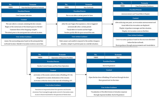 This VR scenario leveraged a 3D model of the demonstration site to create an immersive disaster-response training experience, guiding users through a simulated fire emergency. The training scenario was designed to resemble real-life conditions, allowing users to practice essential responses and build familiarity with emergency protocols. The components of each scenario are shown in Figure 15. The scenario design for realistic disaster-response training, which uses a 3D model of the demonstration site, contains a structured flow that enables users to engage in each phase of the emergency simulation.