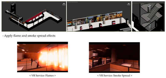 The evacuation simulation service is illustrated in Figure 16. The evacuation simulation service development displays a VR-based training system set in an underground shopping mall. This simulation incorporated realistic fire and smoke effects, providing users with a highly immersive experience designed for both safety and educational value. Key features include optimized visual effects to prevent VR-induced motion sickness, a user-friendly interface to ensure the clear communication of emergency information, and a range of sensory elements such as fire and smoke effects that bring the scenario to life. The simulation service prioritizes user safety by ensuring stability and minimizing VR motion sickness, whereas the educational components focus on providing precise information. By creating a realistic training environment, users become familiar with evacuation routes and emergency systems in a controlled setting, ultimately improving their preparedness for real-world disaster situations.