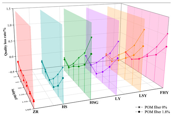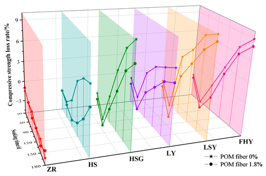 Figure 2 illustrates the compressive strength loss rates of the PFUHPC in various erosive environments. It can be seen from Figure 2 that in the early test, in each group with 1.8% POM fibers, the compressive strength loss rate of the HS1.8% group was −2.0% at 30 days and reached the maximum value of −4.2% at 90 days. The 30-day loss rates of the HSG1.8%, LY1.8%, LSY1.8%, and FHY1.8% groups were −4%, −2%, −3%, and −2%, respectively, and reached the maximum values of −7.2%, −5%, −7.2%, and −6% at 60 days. It can be seen that the loss rates of the HSG1.8% and LSY1.8% groups increased significantly. This may be related to the increase of microcracks in the PFUHPC caused by the dry–wet cycles of seawater, and because corrosive ions are more likely to enter the interior and react with incompletely hydrated cementitious materials to form hydration products. In addition, the water–cement ratio of PFUHPC is small, and the sulfate attack is from the outside to the inside. In the early stage of erosion, it reacts with the cementitious material to form more hydration products [23,24].