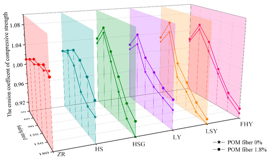 At the end of the experimental period of 180 days, for the groups without POM fibers, the compressive corrosion resistance coefficients for the HS0%, HSG0%, LY0%, LSY0%, and FHY0% groups were, respectively, 0.95, 0.90, 0.94, 0.90, and 0.91. When the POM fiber content was increased to 1.8%, the compressive corrosion resistance coefficients improved, and the compressive corrosion resistance coefficients for the HS1.8%, HSG1.8%, LY1.8%, LSY1.8%, and FHY1.8% groups were, respectively, 0.98, 0.93, 0.96, 0.91, and 0.92.