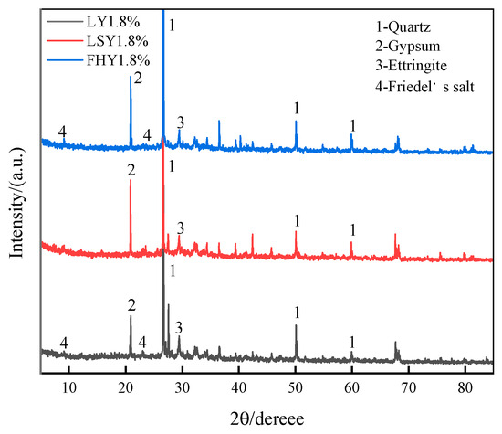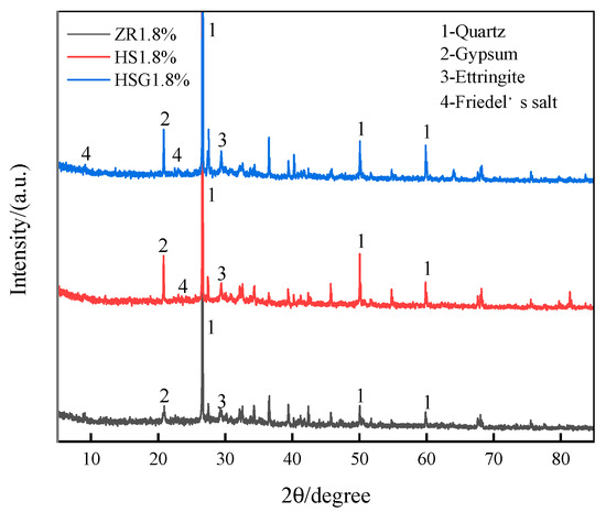Figure 4 and Figure 5, along with Table 4, indicate that the primary corrosion products for the HS, HSG, and FHY groups were consistently ettringite, gypsum, and Friedel’s salt. However, compared to seawater immersion, diffraction peaks of the main corrosion products were more pronounced in complex solutions, where high concentrations of Cl− and SO42− led to the formation of more corrosion products, exacerbating the degradation of the PFUHPC. Conversely, the amounts of gypsum and ettringite generated in complex solution were lower than in sulfate immersion, suggesting that Cl− inhibited the corrosive effects of SO42− on the PFUHPC. This inhibition may be attributed to the stronger penetration and diffusion capabilities of Cl−, which preferentially entered the concrete, consuming part of the C-S-H and forming stable Friedel’s salt, thereby mitigating the erosion caused by SO42− [32].
