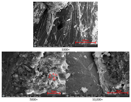 Figure 6 shows the microstructure images of the PFUHPC after 180 days of exposure to a natural environment. The images reveal a large number of amorphous colloidal substances and flaky crystals. Elemental composition analysis of region A indicated that the primary elements in this area were Si, Ca, and O, which correspond to the basic chemical composition of C-S-H gel. The Ca/Si ratio was 1.27, which falls within the typical range of 0.7–1.63 for C-S-H, confirming that the main hydration products in the PFUHPC under natural conditions are C-S-H gel and C-H crystals. The formations of C-S-H gel and C-H not only filled the internal pore structure of the material, reducing the number of pores and crack widths in the matrix, but also promoted the close bonding of the interfacial transition zone, enhancing the overall structural continuity of the material. This effectively improved the compressive strength and durability of the PFUHPC, enabling it to resist external environmental erosion and thereby extending the service life of the PFUHPC concrete [33,34].