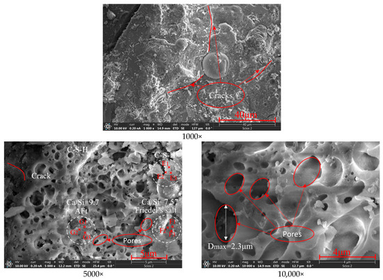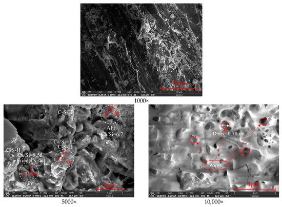 The main corrosion products in the composite salt solution were gypsum, ettringite, and Friedel’s salt. Similar to sulfate immersion, the high concentration of SO42− corrosion products caused significant damage to the concrete. However, the severity of the corrosion was weaker than that observed in sulfate immersion. This is consistent with the earlier XRD analysis, which showed that Cl− had a stronger penetration and diffusion ability, and preferentially entered the concrete, consuming some of the C-S-H while forming stable Friedel’s salt. This process delayed the erosion effect of SO42−. Therefore, the PFUHPC exposed to the composite salt solution demonstrated better compressive strength and durability than the PFUHPC exposed to the sulfate solution [42].