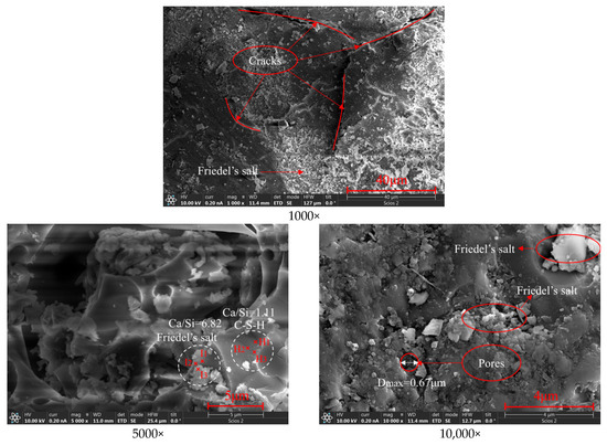 After chloride salt immersion, Cl− reacted with C-S-H gel and C3A, forming a large amount of Friedel’s salt, leading to numerous pores and depressions on the concrete surface. The connectivity between the pores also increased. At this stage, the concrete matrix surface showed many cracks, and the increases in surface porosity and cracks reduced the effective load-bearing area of the concrete, intensifying the stress concentration and significantly reducing the compressive strength of the PFUHPC. The interface transition zone between the aggregates and the paste became blurred, and the overall adhesion worsened, making it difficult for the concrete to effectively transmit stress under load, further weakening the overall strength. The connected pores and numerous cracks provided a convenient pathway for chloride ions to enter the concrete, increasing the number of Friedel’s salts formed by ion reactions, leading to larger surface cracks and a sharp decline in the concrete structure’s durability [38,39].