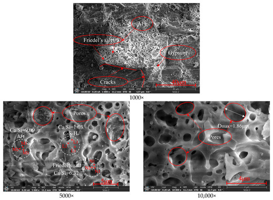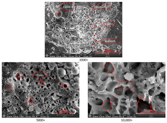 SO42− ions in the sulfate solution entered the concrete and reacted with hydration products, generating large amounts of gypsum and ettringite. As a result, Ca2+ ions were leached and concentrated, forming loose materials with a significant increase in the Ca/Si ratio. Due to the high concentration of SO42−, numerous needle-like ettringite crystals and short-column gypsum crystals can be observed in the images. As the corrosion period progressed, the formation of ettringite and gypsum generated expansive stress, leading to the formation of cracks in the concrete matrix. Once microcracks formed, SO42− ions, driven by diffusion, entered the concrete through these cracks, further compromising the integrity of the concrete structure and lowering the compressive strength and durability of the PFUHPC. Therefore, long-term immersion in sulfate solution significantly accelerated the degradation of the PFUHPC concrete [40,41].