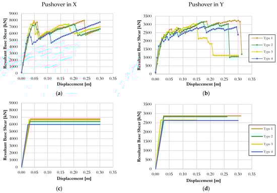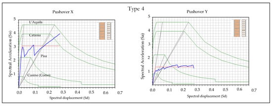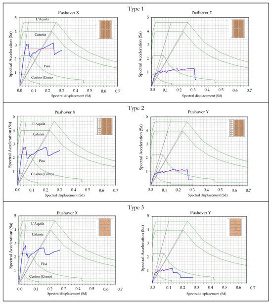 - From a seismic evaluation, the cities of L’Aquila and Catania present a higher seismic demand compared to Cusino and Pisa. The pushover curves for the four types of infill walls were calculated in both the X and Y directions.