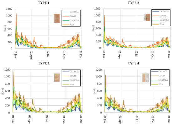 - From an energy evaluation, the masonry infill Type 2 appears to have the lowest annual energy dispersion, followed by Types 1, 4, and 3. In particular, the masonry infill Type 2, consisting of two layers of hollow bricks, shows lower annual dispersion values, and thus a better performance, in all the locations considered during this study. Specifically, in L’Aquila, in Climatic Zone E, Type 2 has an annual dispersion of 27,227.22 kWh; in Catania, in Climatic Zone B, it disperses 18,739.23 kWh in a year, which is the lowest value recorded in our analyses; in Pisa, in Climatic Zone D, it disperses 27,819.47 kWh; and finally, in Como, in Climatic Zone F, it disperses 45,579.88 kWh. Thus, averaging across all four cities analyzed, it results in a dispersion of 29,841.45 kWh over the course of a year, significantly lower than the average annual dispersion values recorded for the Type 1 infill, consisting of a single layer of hollow bricks with an average dispersion of 35,846.99 kWh, for the Type 3 infill, made solely of solid bricks with an average dispersion of 36,586.96 kWh, and for the Type 4 infill, which consists of one layer of solid bricks and one layer of hollow bricks with an air cavity between the two layers, dispersing an average of 41,354.08 kWh.