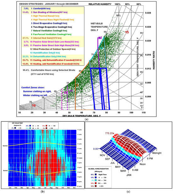 Weather diagrams of Xiamen obtained from Climate Consultant, weather data from Energyplus: (a) enthalpy diagram; (b) global horizontal radiation diagram; (c) 3D charts of dry bulb temperature.
