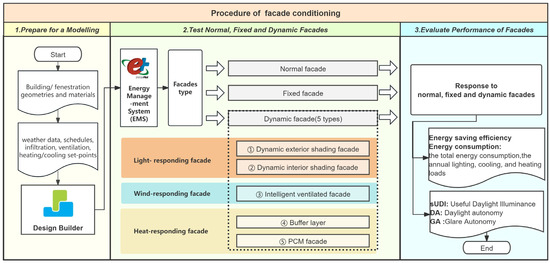 This study used DesignBuilder for simulations, a building performance simulation software developed with EnergyPlus as the core, and this program allows for the simulation and analysis of the building energy consumptions of heating, cooling, lighting, ventilation, and other energy flows, with wide practicality, flexibility, and convenience [26]. In this study, the Energy Management System (EMS) module of the software, an advanced control method of EnergyPlus [24], was also utilized in the simulation of dynamic facades to implement customized control strategies. The flowchart of the simulation process is depicted in Figure 2.