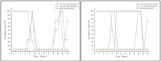 The indoor environmental parameters for the built environment control, the thermal properties of the building envelope, and the schedule of occupancy are listed in Table S1 and Figure 3. The operating schedule of the air conditioning was based on a standard residential mode, and there was no air conditioning in the kitchen and bathroom. The indoor illumination measurement points were at the centers of the rooms. When the indoor illumination was low, the lights were turned on. The lighting power was linearly related to illumination levels.