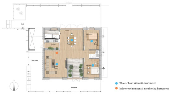 To test the influence of the dynamic facades on the indoor environment comfort, the team carried out the measurements of indoor and outdoor environmental parameters via equipment provided by the organizing committee, including Jantytech brand devices for temperature, relative humidity, wind speed, wind direction, solar radiation, and other environmental parameters. The power generation generated by the solar photovoltaic panels and the energy consumption of the building were monitored via three-phase kilowatt-hour meters. Detailed information of the equipment used in this study is shown in Table 3. Figure 4 illustrates the layout of this house, the measurement points, the measured parameters, and the measurement instruments.