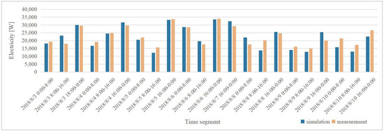 Indoor temperature, mechanical ventilation, lighting, and electrical appliance usage were set according to the measurements during the competition. A comparison of measured and simulated results is shown in Table 4. This study compares hourly electricity consumption to assess the margin of error, and the simulated data were consistent with the measured data (Figure S3). Furthermore, the competition was divided into multiple time periods, and comparing electricity consumption across these periods resulted in a better fit (Figure 5). This improvement may be attributed to the lag in the performance of dynamic facade energy consumption.